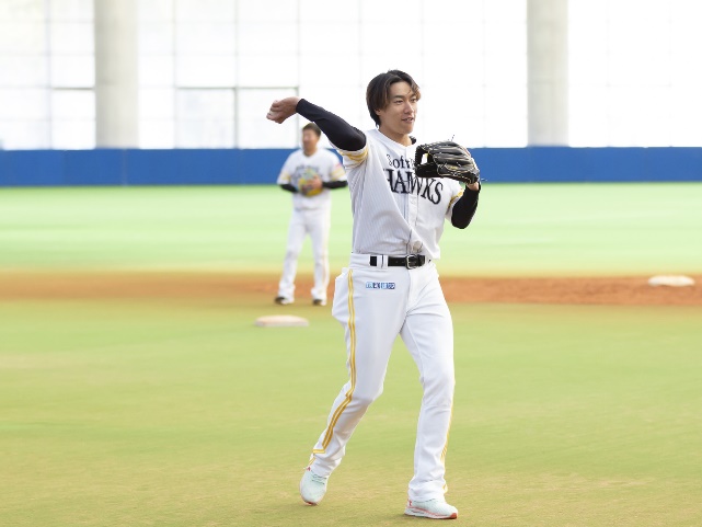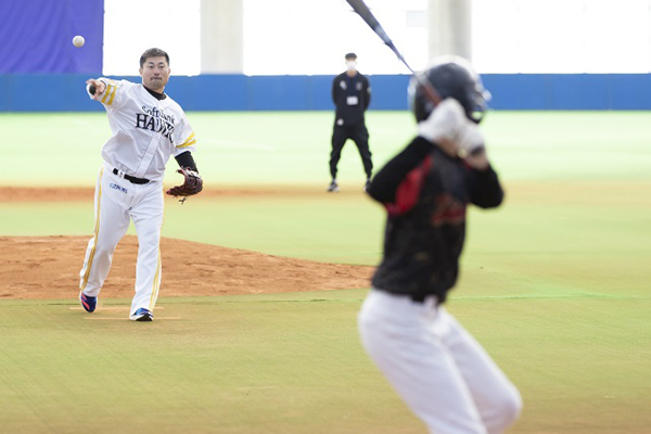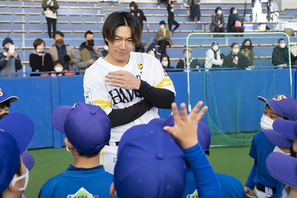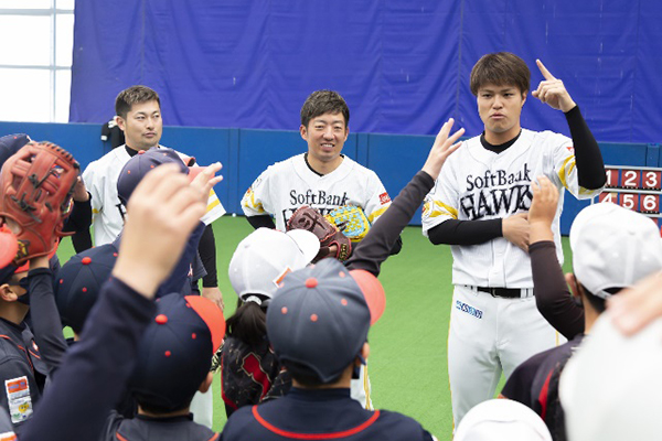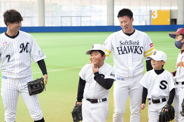 柳田悠岐選手:みんな元気があって、こちらもパワーをもらえました。子どもたちには楽しんでもらいつつ、今学ぶべきことを中心にアドバイスしました。毎日練習に励み、この中から夢を叶えてほしいです。