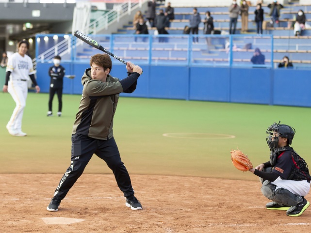 教室ではバッティング、ピッチング、守備に分かれ、約2時間にわたりプロ野球選手から直接指導が行われました。バッティング練習では、柳田選手と吉田選手が指導。柳田選手は子どもたちのスイングをチェックし「軸足で溜めを作りながら、ボールが来たらグッと前足を踏み込むことが重要」と説明、吉田選手は「素振りは、ただ回数を増やすだけでなく全力でスイングし、納得できる回数を行うことが大事」とアドバイスしました。